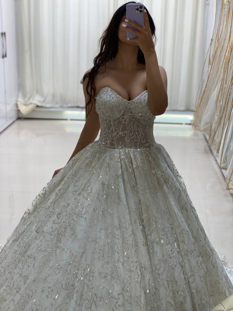 لباس عروس عربی شایندار با یقه دکلته انتخابی ایدهآل برای عروسهایی است که میخواهند در روز عروسی استایلی لوکس، جذاب و منحصر به فرد داشته باشند. طراحی سایندار لباس، فرم بدن را به زیبایی نشان میدهد و یقه دکلته جلوهای مدرن و شیک به بالاتنه میبخشد.