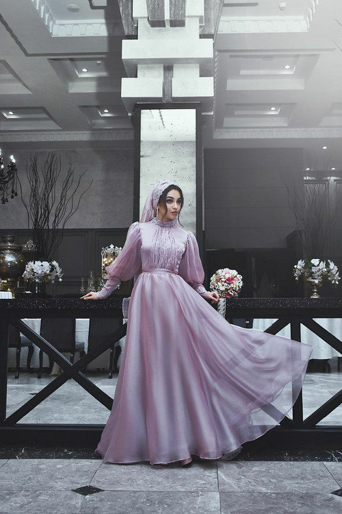 مدل لباس نامزدی رنگ یاسی با پارچه حریر | شیک و خاص
