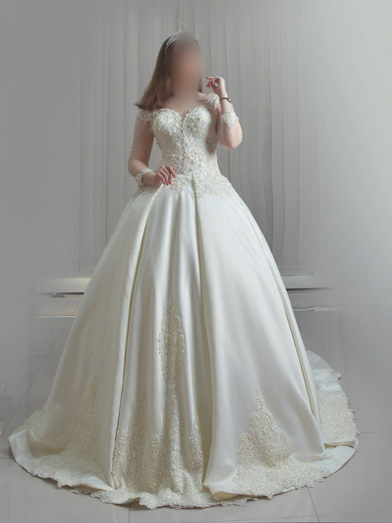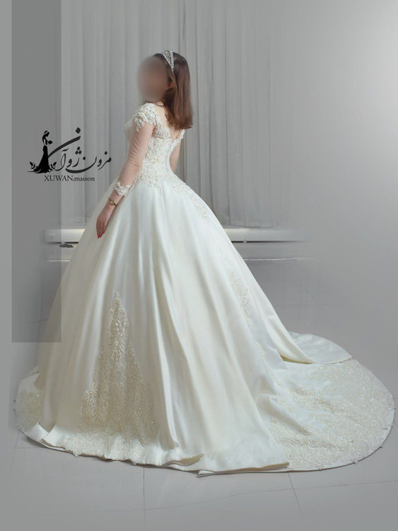 دامن این لباس با کار دست ظریف و نقشهای درخشان در پایین دامن، جلوهای مجلل و چشمگیر دارد و هنگام حرکت، مثل نوری نرم روی زمین میدرخشد.