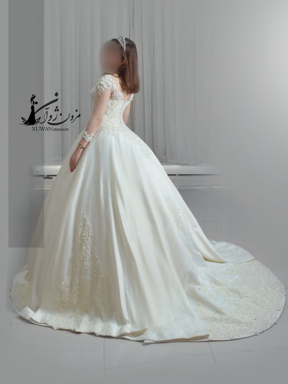 دامن این لباس با کار دست ظریف و نقشهای درخشان در پایین دامن، جلوهای مجلل و چشمگیر دارد و هنگام حرکت، مثل نوری نرم روی زمین میدرخشد.